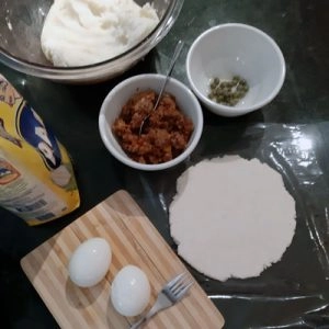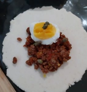 - Sobre la masa, coloca la carne molida o picadillo previamente preparado, el huevo duro y las alcaparras.100 g Carne Molida preparada, 8 Alcaparras, 2 huevos