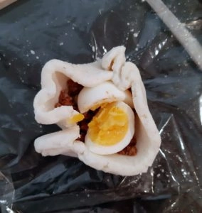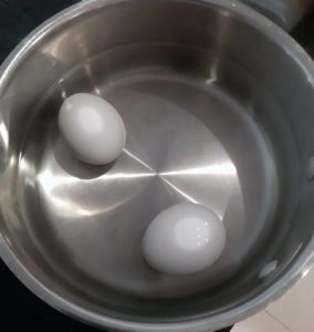 - Hierve los huevos durante 10 min. a fuego alto, descascara y pícalos en 42 huevos