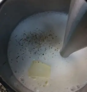 - Agregar la mantequilla temperatura ambiente, la sal y pimienta y mezclar bien con un batidor de mano o eléctrico.